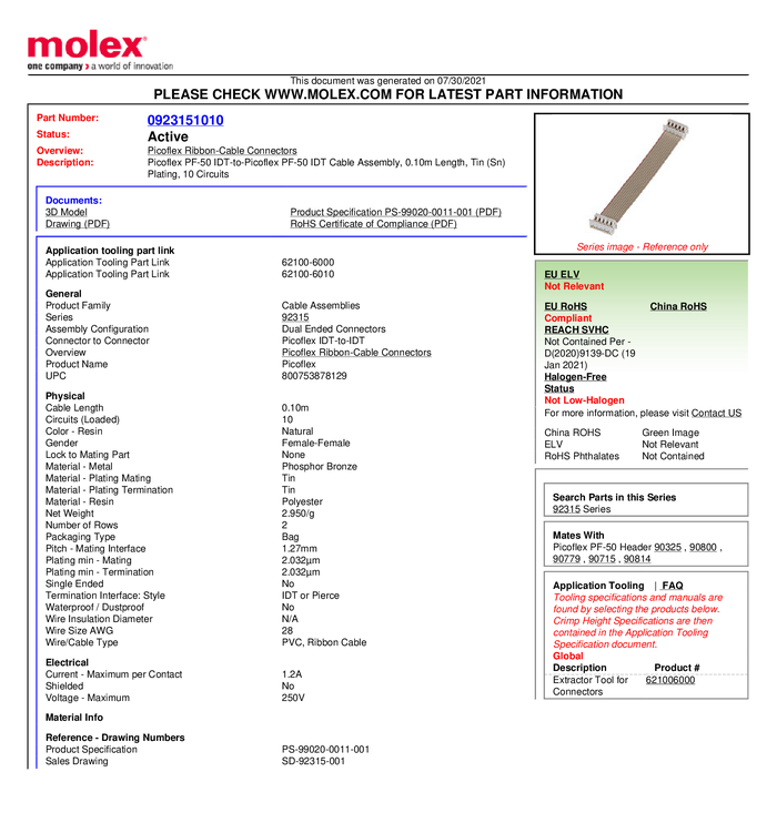 Molex Obudowa złącza pin żeńskiego na kabel Ilość pinów 10 Wymiary siatki: 1.27 mm 923151010 1 szt. torba