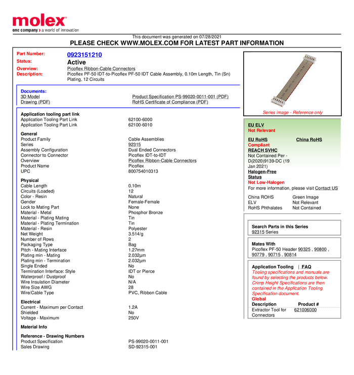 Molex Obudowa złącza pin żeńskiego na kabel Ilość pinów 12 Wymiary siatki: 1.27 mm 923151210 1 szt. torba