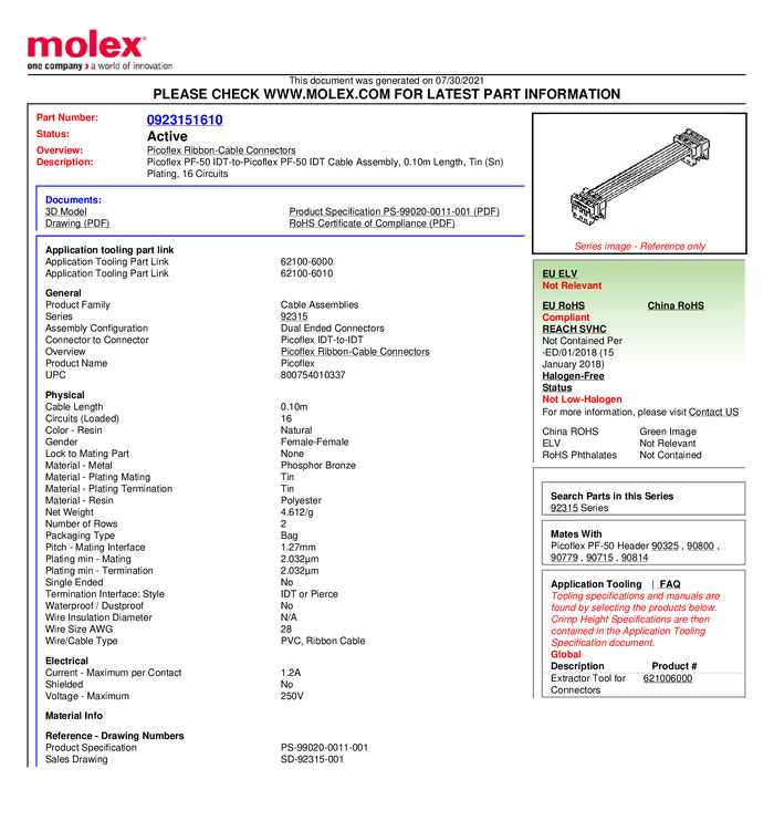 Molex Obudowa złącza pin żeńskiego na kabel Ilość pinów 16 Wymiary siatki: 1.27 mm 923151610 1 szt. torba