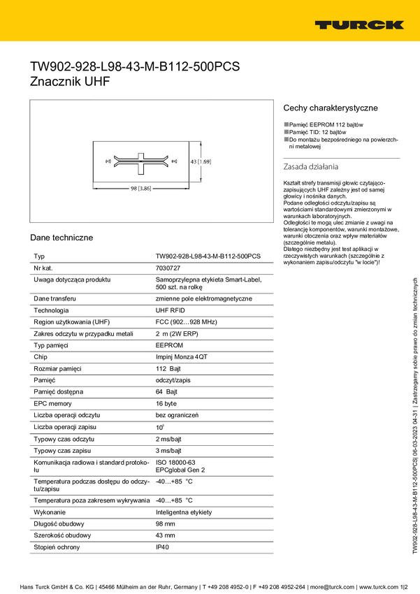Turck TW902-928-L98-43-M-B112-500PCS Transponder RFID