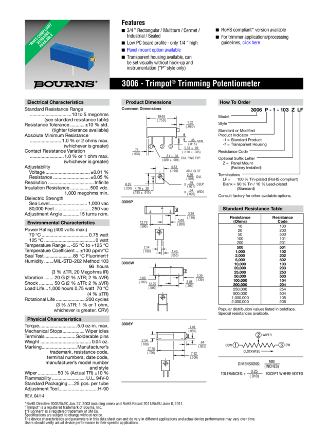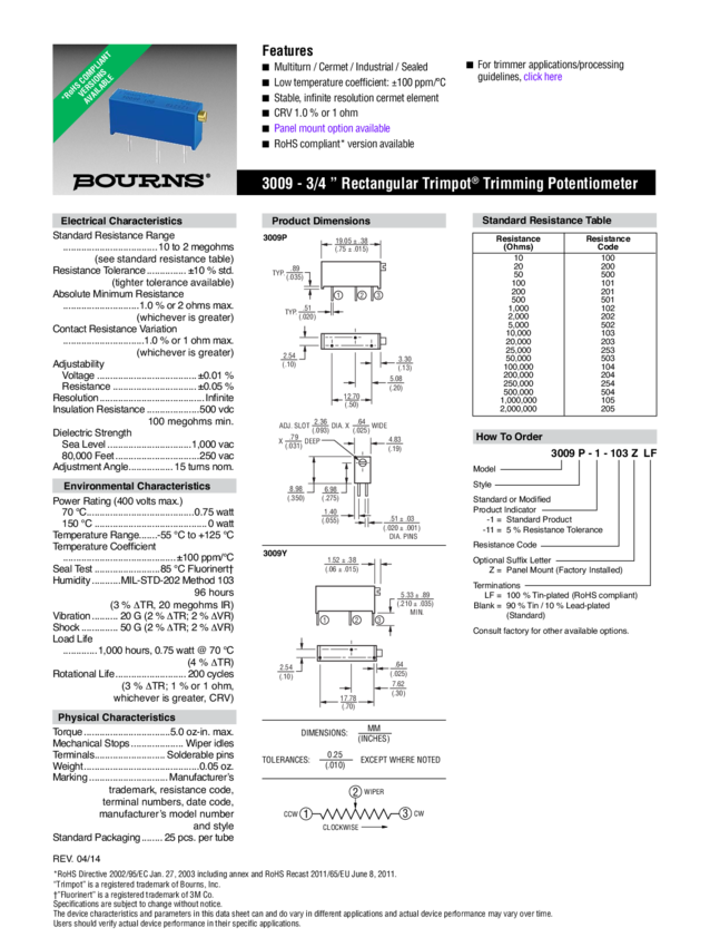 Res Cermet Trimmer 500 Ohm 10% 3/4W 15(Elec)Turn 2.54mm (26.67 X 7.92mm) Pin Panel Mount/Through Hole Tube
