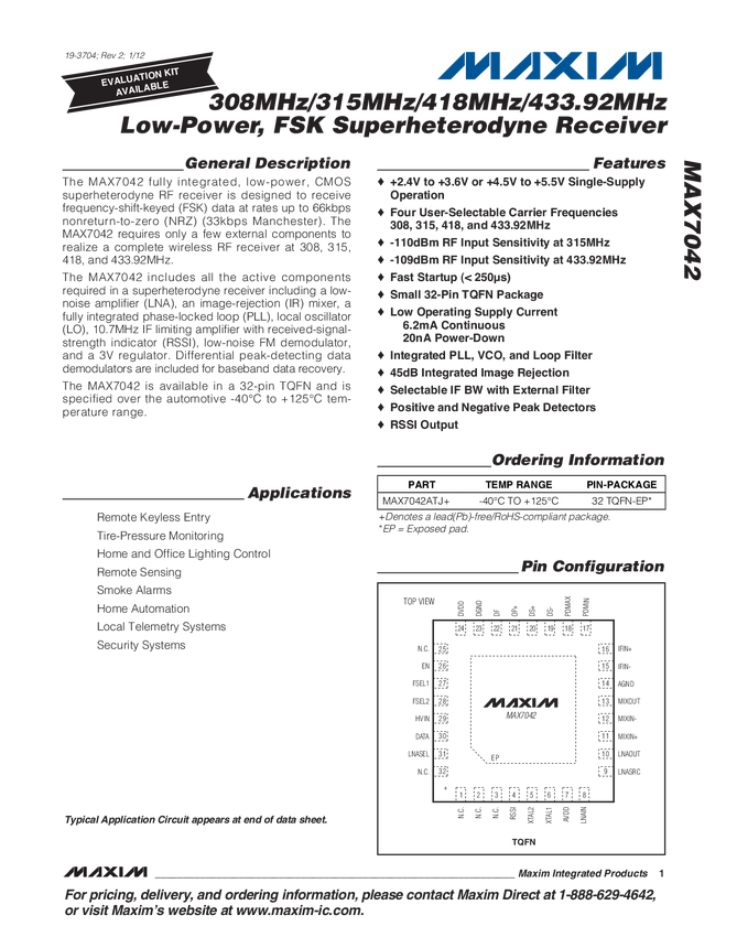 308MHz/315MHz/418MHz/433.92MHz Low-Power, FSK Superheterodyne Receiver