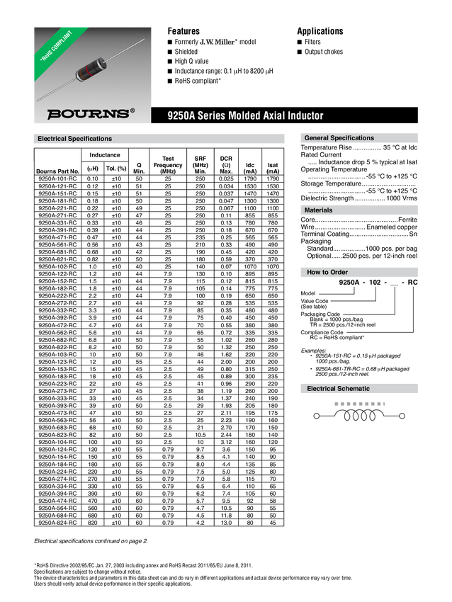 Dławik; osiowy; 470uH; 92mA; 9R5; 10%; fi 4,11x10,41mm; osiowy; THT; BOURNS; 9250A-474-RC; RoHS
