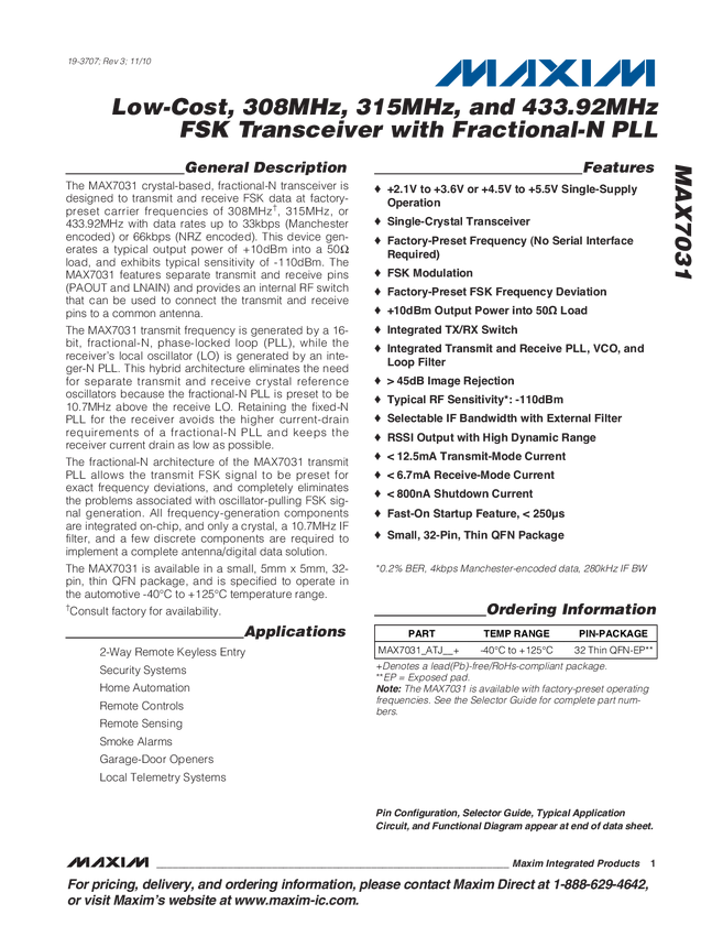 Low-Cost, 308MHz, 315MHz, and 433.92MHz FSK Transceiver with Fractional-N PLL