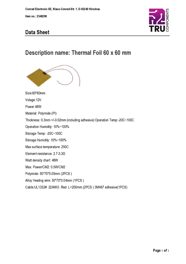 TRU COMPONENTS TC-9393192 Folia grzewcza, 250 °C, 48 W, (D x S) 60 mm x 60 mm