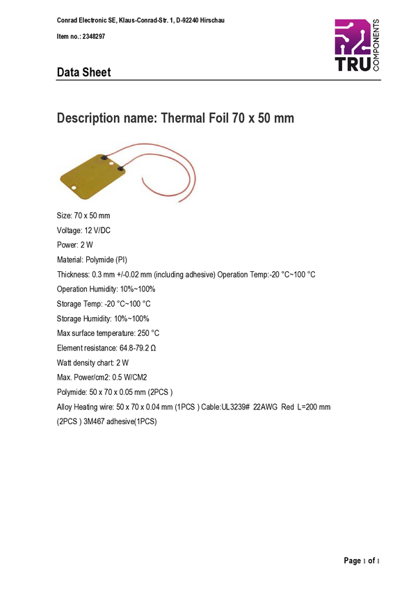 TRU COMPONENTS TC-9393188 Folia grzewcza, 250 °C, 2 W, (D x S) 70 mm x 50 mm