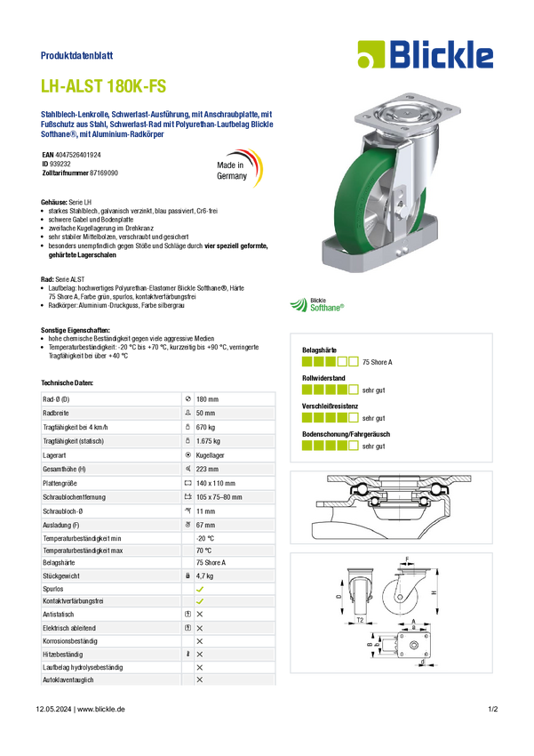 Blickle 939232 LH-ALST 180K-FS Rolka obrotowa z blachy stalowej Średnica koła: 180 mm Maksymalne obciążenie: 670 kg 1 sz