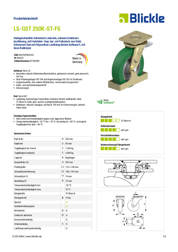 Blickle 939275 LS-GST 250K-ST-FS Koło obrotowe do dużych obciążeń Średnica koła: 250 mm Maksymalne obciążenie: 1200 kg 1
