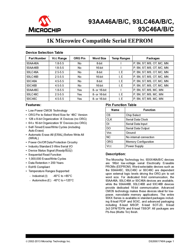 93AA46A/B/C, 93LC46A/B/C, 93C46A/B/C 1-Kbit Microwire Compatible Serial EEPROM Data Sheet