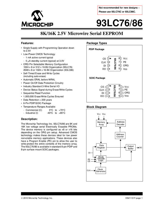 93AA86A/B/C, 93LC86A/B/C, 93C86A/B/C 16-Kbit Microwire Compatible Serial EEPROM Data Sheet