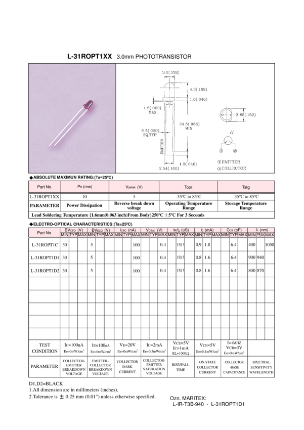 Fototranzystor IR 940nm, D=3mm
