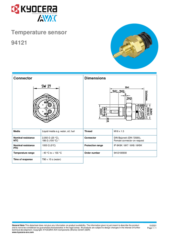 Czujnik temperatury KYOCERA/AVX 9412100900, -40 do 155 °C
