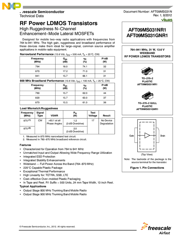 Airfast Wideband RF Power LDMOS Transistor, 764-941 MHz, 31 W, 13.6 V