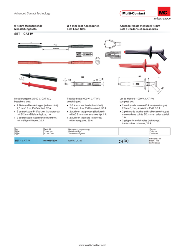 Stäubli 9410494500 Zestaw przewodów pomiarowych bezpiecznych złącze męskie, lamelkowe 4 mm złącze męskie, lamelkowe 4 mm