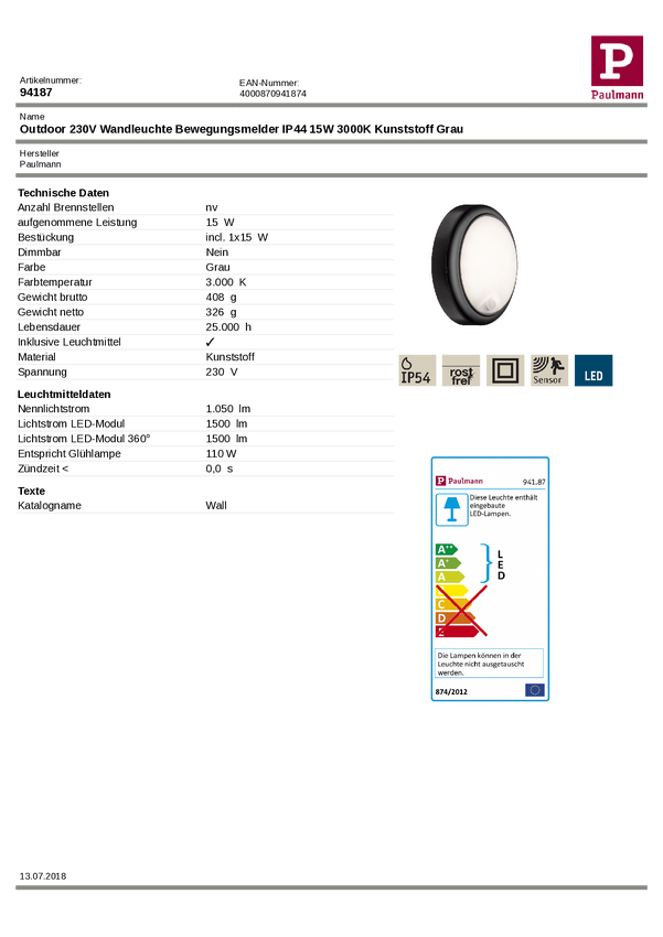 Zewnętrzna lampa ścienna z czujnikiem ruchu Paulmann 94187 15 W 1050 lm IP44