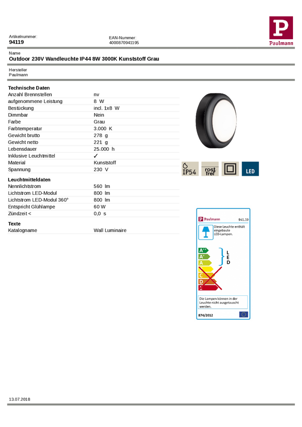 Zewnętrzna lampa ścienna Paulmann 94119 8 W 560 lm IP54