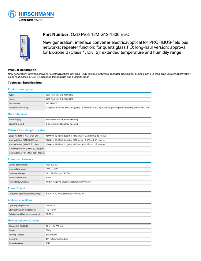 Konwerter interfejsu Hirschmann 942 148-013 Profibus 24 V/DC