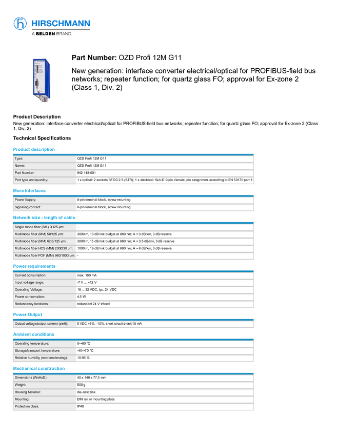 Konwerter interfejsu Hirschmann 942 148-005 Profibus 24 V/DC