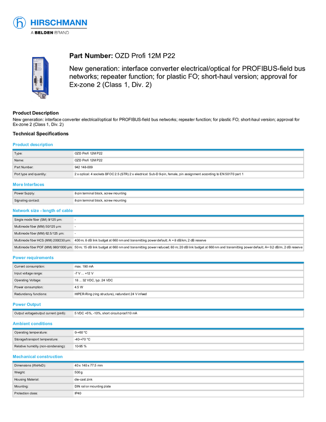 Konwerter interfejsu Hirschmann 942 148-009 Profibus 24 V/DC