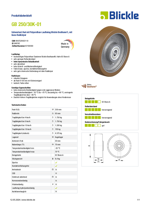 Blickle 948742 GB 250/30K-01 Koło do dużych obciążeń Średnica koła: 250 mm Maksymalne obciążenie: 1750 kg 1 szt.