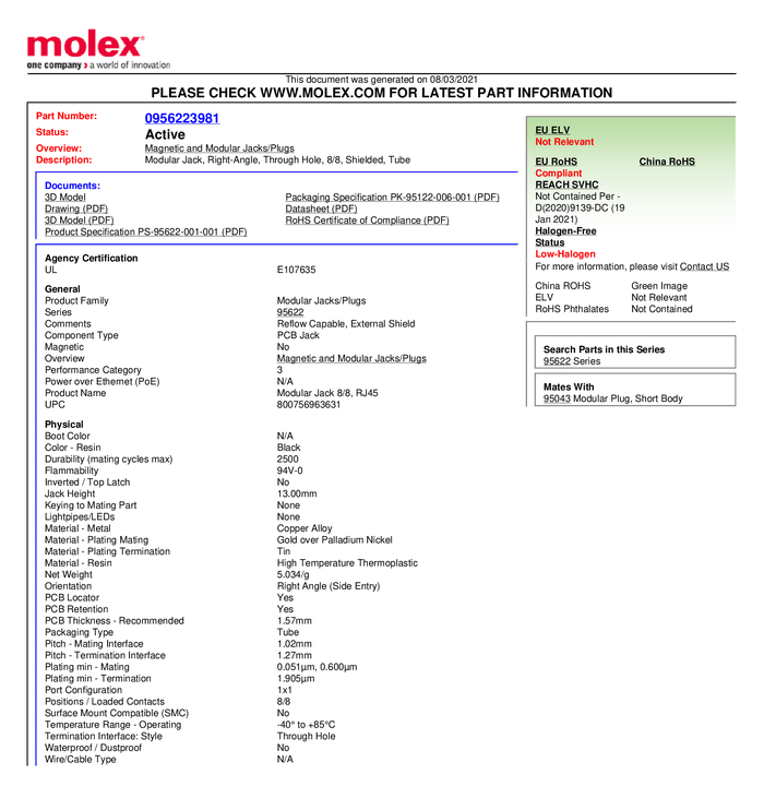 Molex gniazdo Molex 956225881 gniazdo Ilość pinów 8P8C 1 szt.