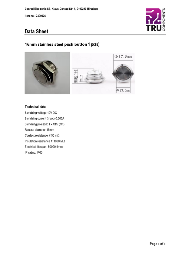 TRU COMPONENTS TC-9563744 Przycisk, 16 mm, 12 V, 0.005 A, 1 szt.