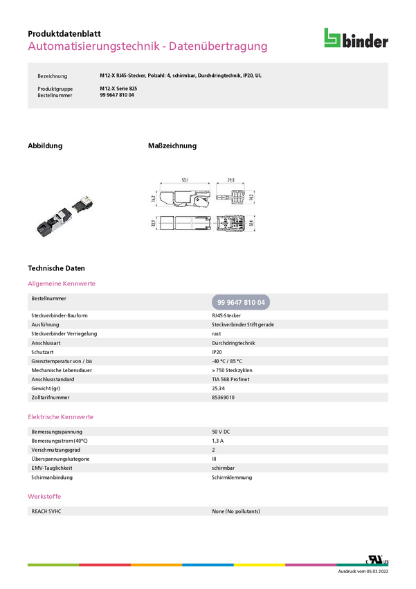 binder 99 9647 810 04-20 Złącze czujnika/aktuatora 99 9647 810 04, piny: 4, 1 szt.