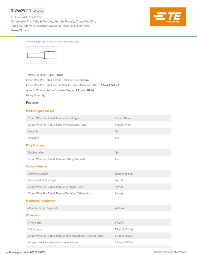 TE Connectivity 3-966292-1 TE AMP Other Insulated Terminals and Splices, 1 szt.