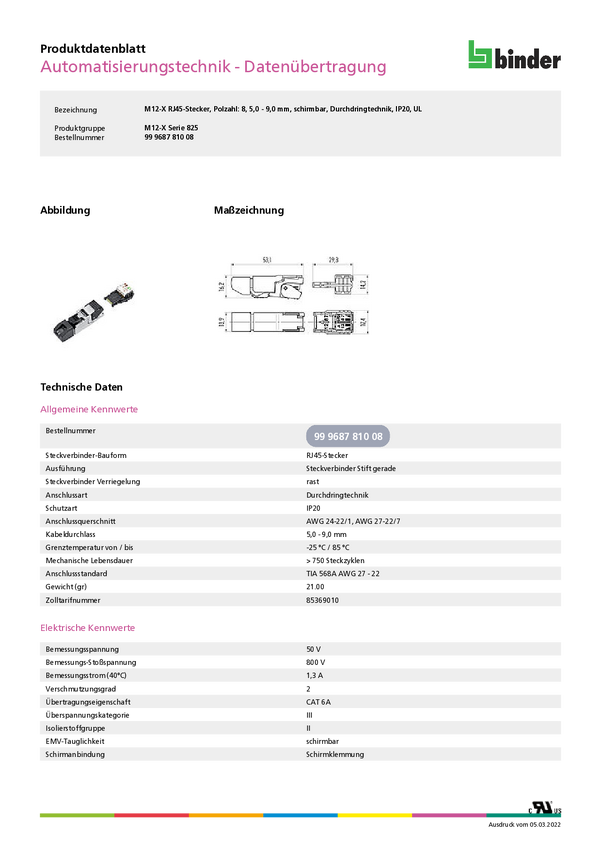 binder 99 9687 810 08-20 Złącze czujnika/aktuatora złącze męskie proste Ilość pinów: 8 1 szt.