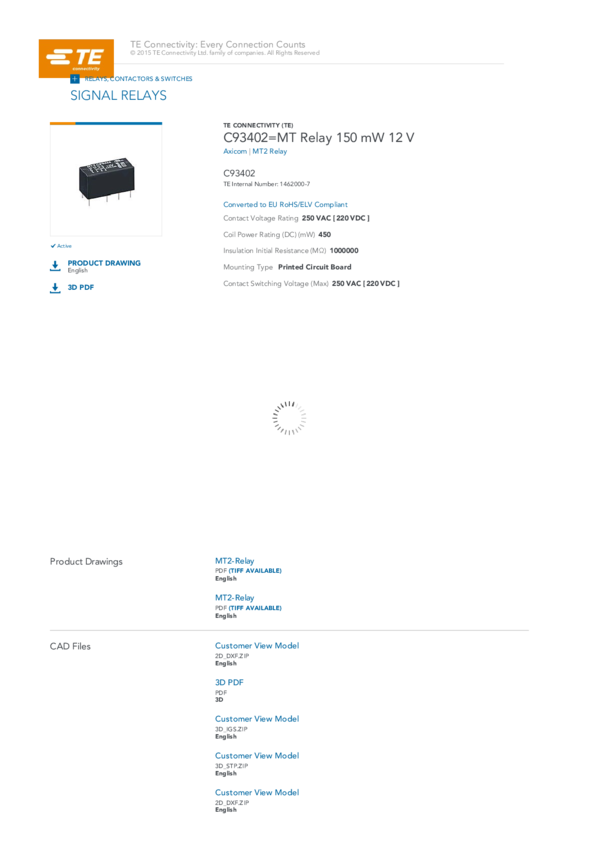 Electromechanical Relay DPDT 2A 12VDC 968Ohm Through Hole