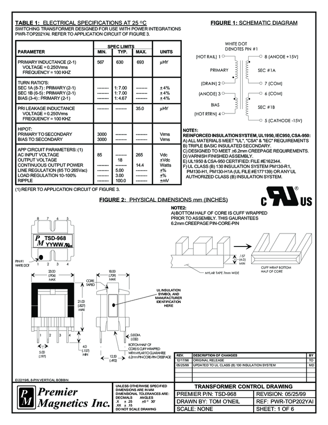 Power Transformer 7:1/7:1/4.67:1 Single+Auxilary Prim. Dual Sec. 265V Prim. 18V Sec. Through Hole