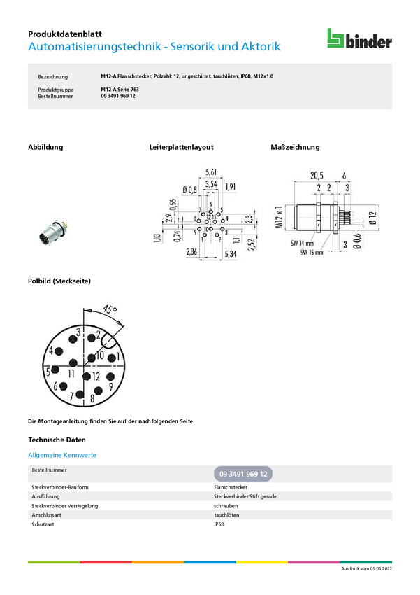 binder 09 3491 969 12-20 Złącze niekonfekcjonowane czujnika/aktuatora 09 3491 969 12, piny: 12, 1 szt.