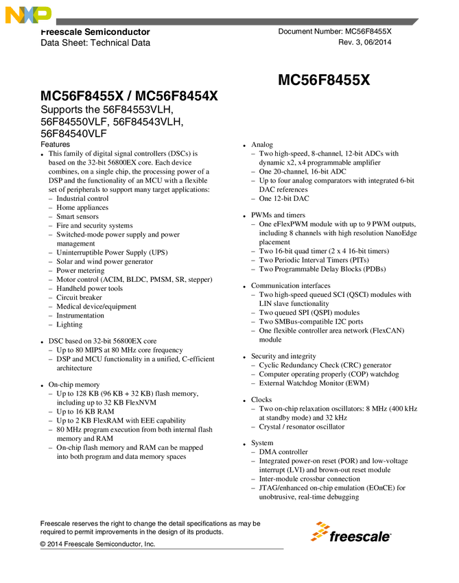 32-bit DSC, 56800EX core, 96KB Flash, 80MHz, QFP 64
