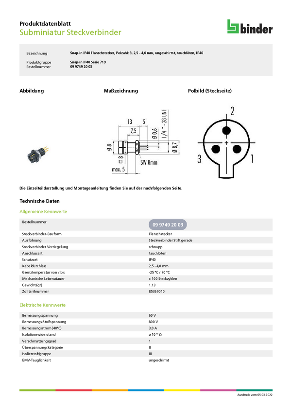 binder 09 9749 20 03-20 Złącze męskie kołnierzowe 09 9749 20 03, 1 szt.