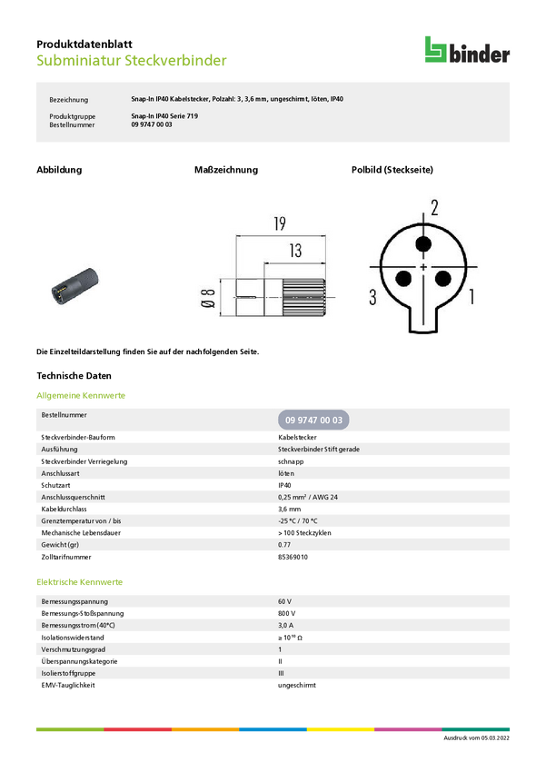 binder 09 9747 00 03-20 Złącze męskie kablowe 09 9747 00 03, 1 szt.