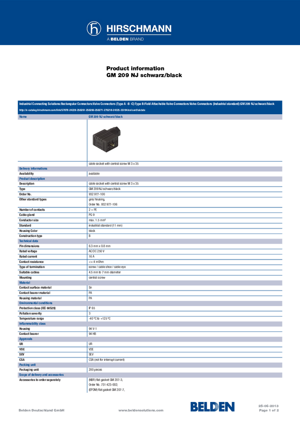 Złącze czarny GM 209 NJ Ilość styków:2 + PE 932 977-100-200 Hirschmann Zawartość: 200 szt.