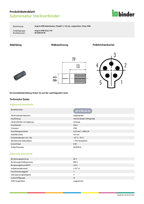 binder 09 9789 00 05-20 Złącze męskie kablowe 09 9789 00 05, 1 szt.
