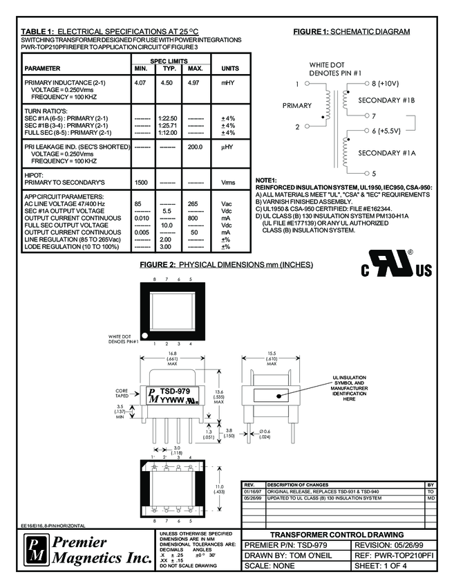 Power Transformer 22.5:1/25.71:1/12:1 Single Prim. Dual Sec. 265V Prim. 5.5V/10V Sec. Through Hole