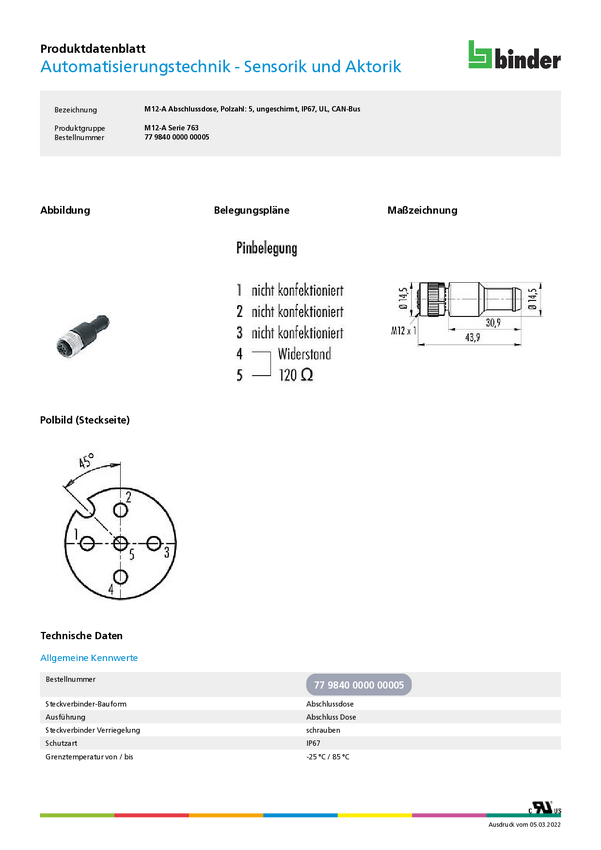 binder 77 9840 0000 00005-20 Złącze czujnika/aktuatora 77 9840 0000 00005, piny: 5, 1 szt.