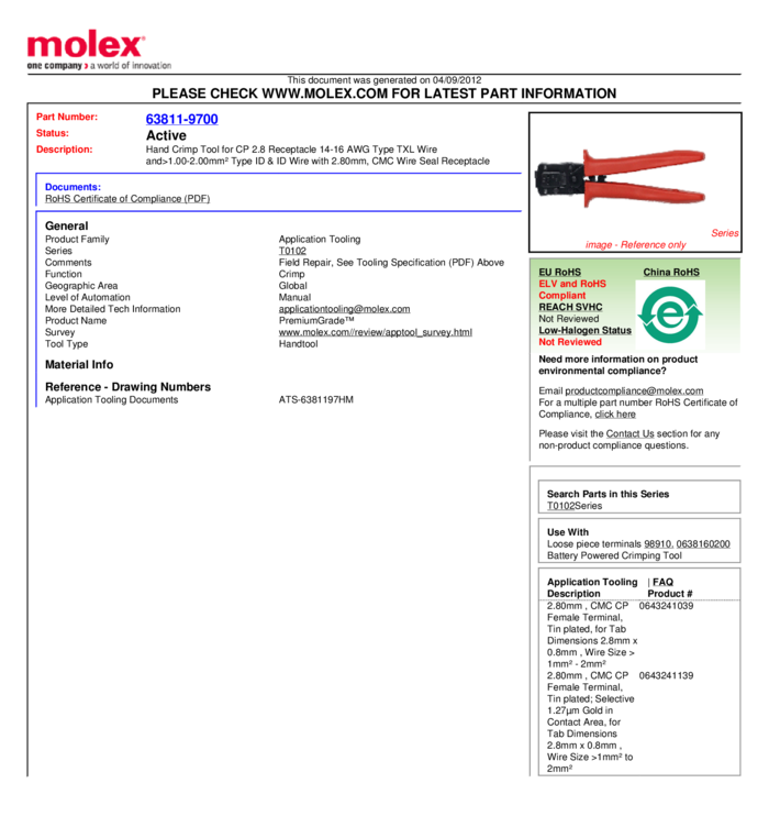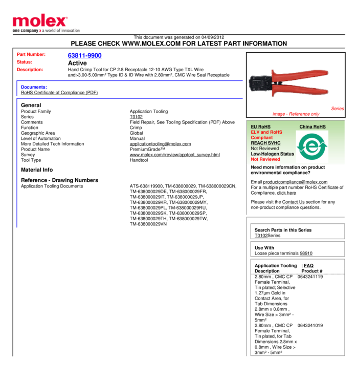 Hand Crimp Tool for 98910 Series Loose Piece Terminals
