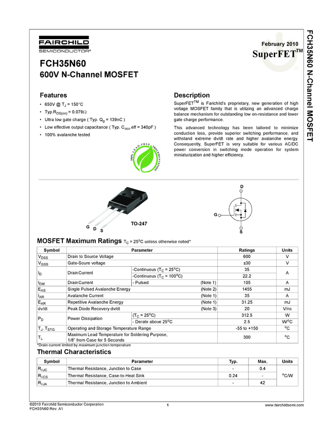 N-Channel SuperFET® MOSFET 600V, 35A, 98mΩ