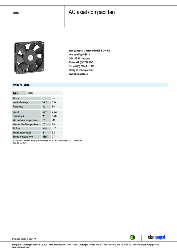 AC Fan Ball Bearing 230V 14W 50Hz 2450RPM 68.9CFM 37dB Flange Mount