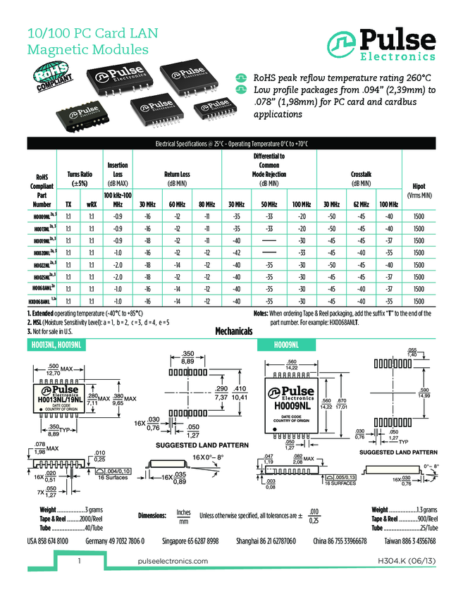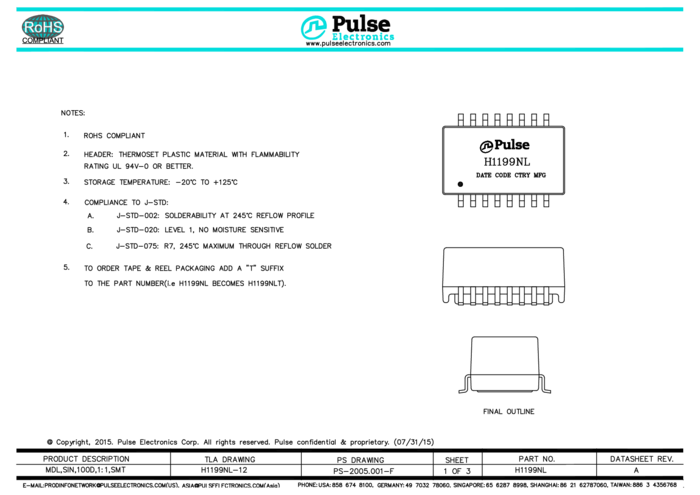 Telecom Transformer 1:1/1:1 1500Vrms -0.9dB Surface Mount
