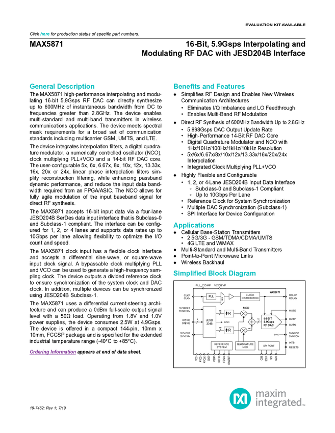 16-Bit, 5.9Gsps Wideband Interpolating and Modulating RF DAC with JESD204B Interface