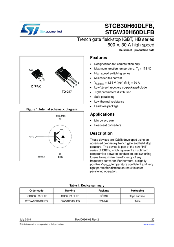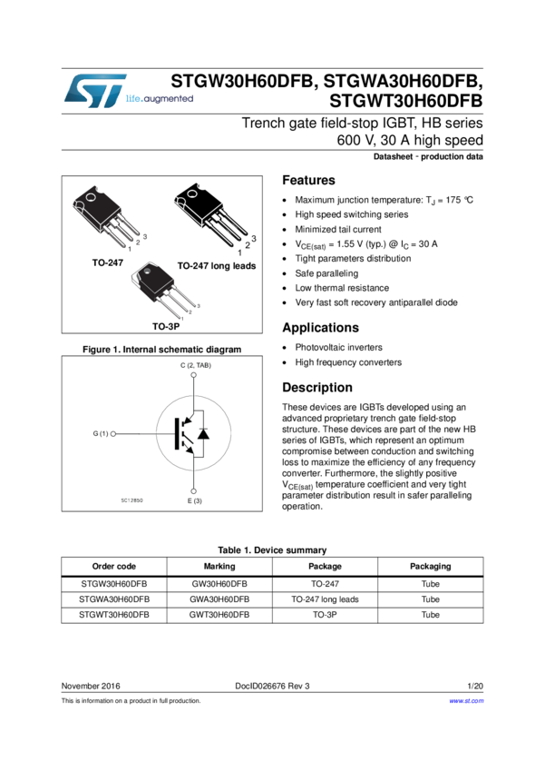 Trench gate field-stop IGBT, HB series 600 V, 30 A high speed