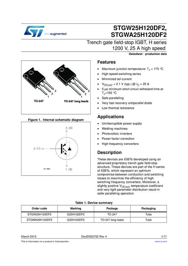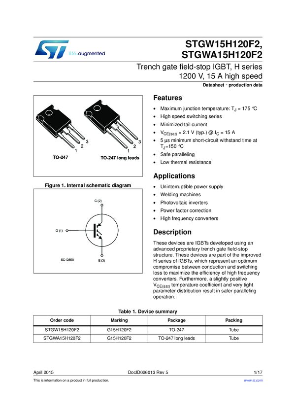 Trench gate field-stop IGBT, H series 1200 V, 15 A high speed