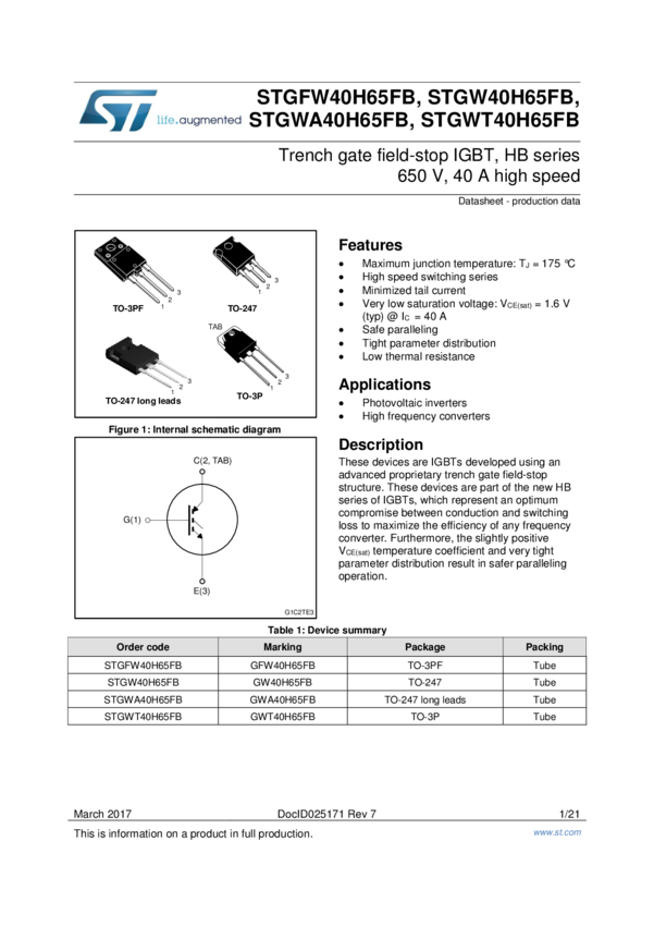 Trench gate field-stop IGBT, HB series 650 V, 40 A high speed