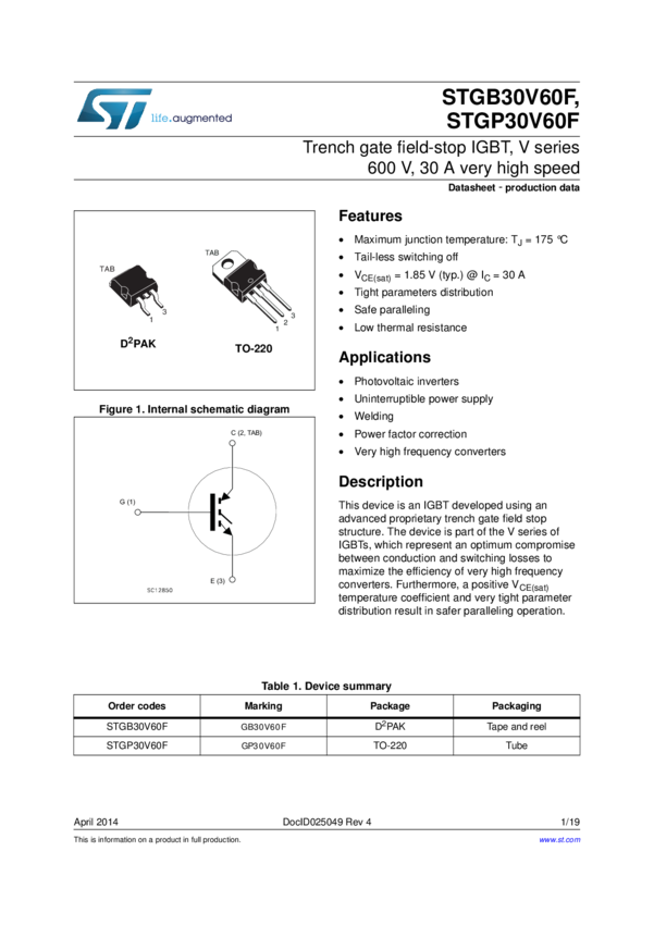 Trench gate field-stop IGBT, V series 600 V, 30 A very high speed