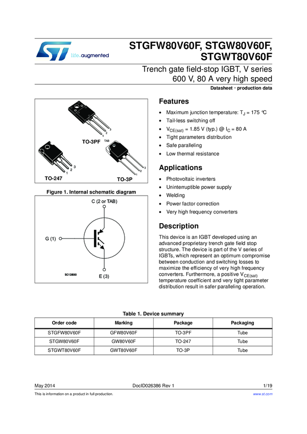 Trench gate field-stop IGBT, V series 600 V, 80 A very high speed