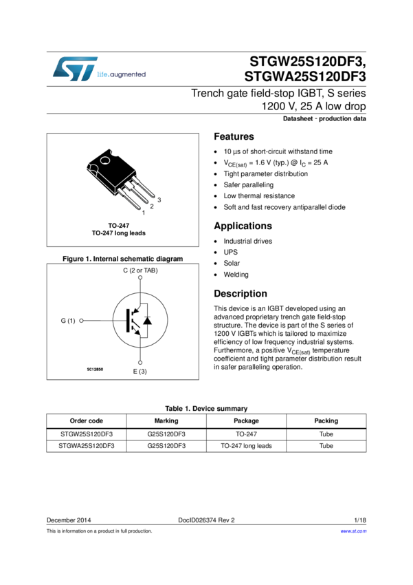 Trench gate field-stop IGBT, S series 1200 V, 25 A low drop